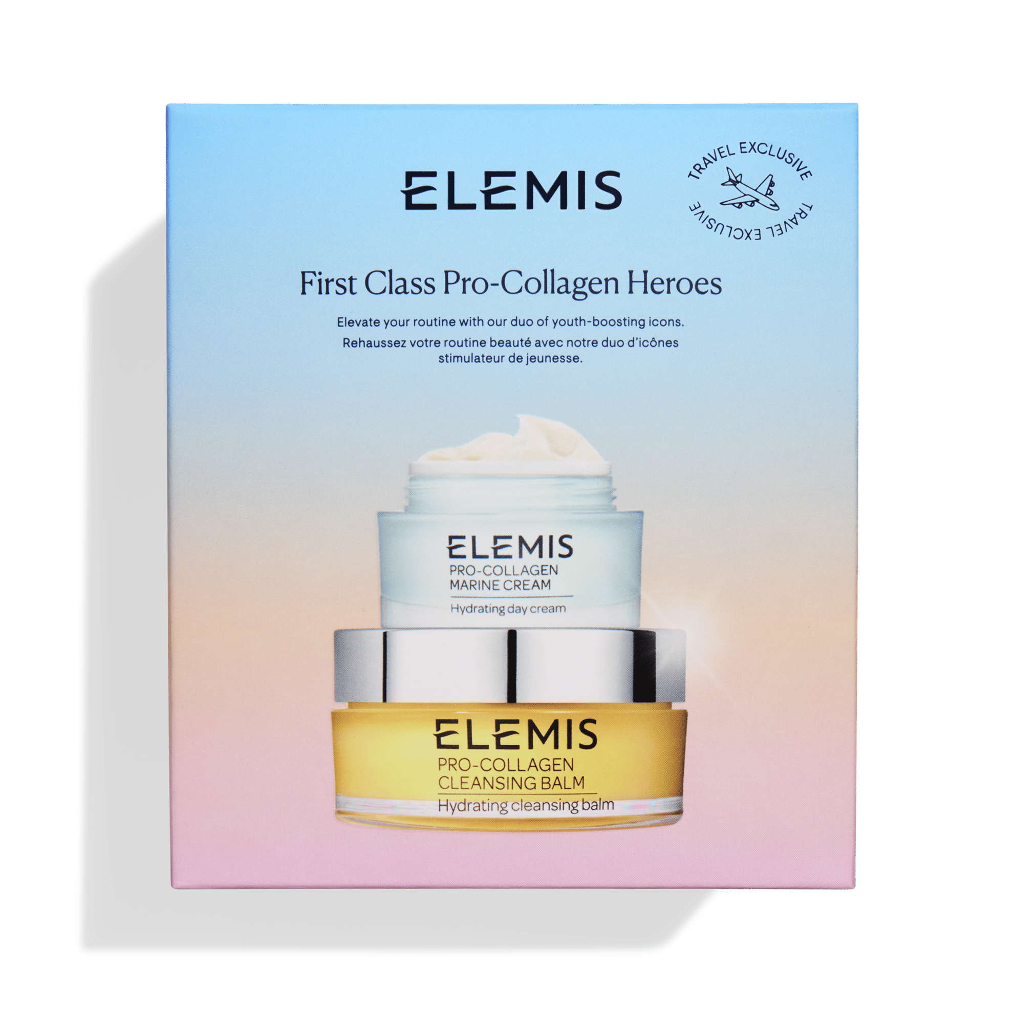 Elemis First Class Pro-Collagen Heroes Travel Retail Exclusive сет нь таны гоо сайхны өдөр тутмын арчилгааг хоёр алдартай бүтээгдэхүүнээр бүрдүүлсэн онцгой иж бүрдэл юм: Pro-Collagen Marine Cream (30 мл): Нарны хамгаалалттай, хөгшрөлтийн эсрэг хөнгөн бүтэцтэй өдрийн тос нь арьсыг чийгшүүлж, уян хатан болгож, үрчлээг мэдэгдэхүйц багасгахад тусалдаг. Pro-Collagen Cleansing Balm (100 г): Арьсыг гүн цэвэрлэж, тэжээл өгч, зөөлрүүлэн чийгшүүлэх SPA мэдрэмжтэй олон үүрэгт бальзам. Энэхүү тансаг багц нь аялалд төгс тохиромжтой бөгөөд арьсаа эрүүл, гэрэлтсэн, залуу харагдуулах хамгийн чухал хоёр бүтээгдэхүүнийг багтаасан.
