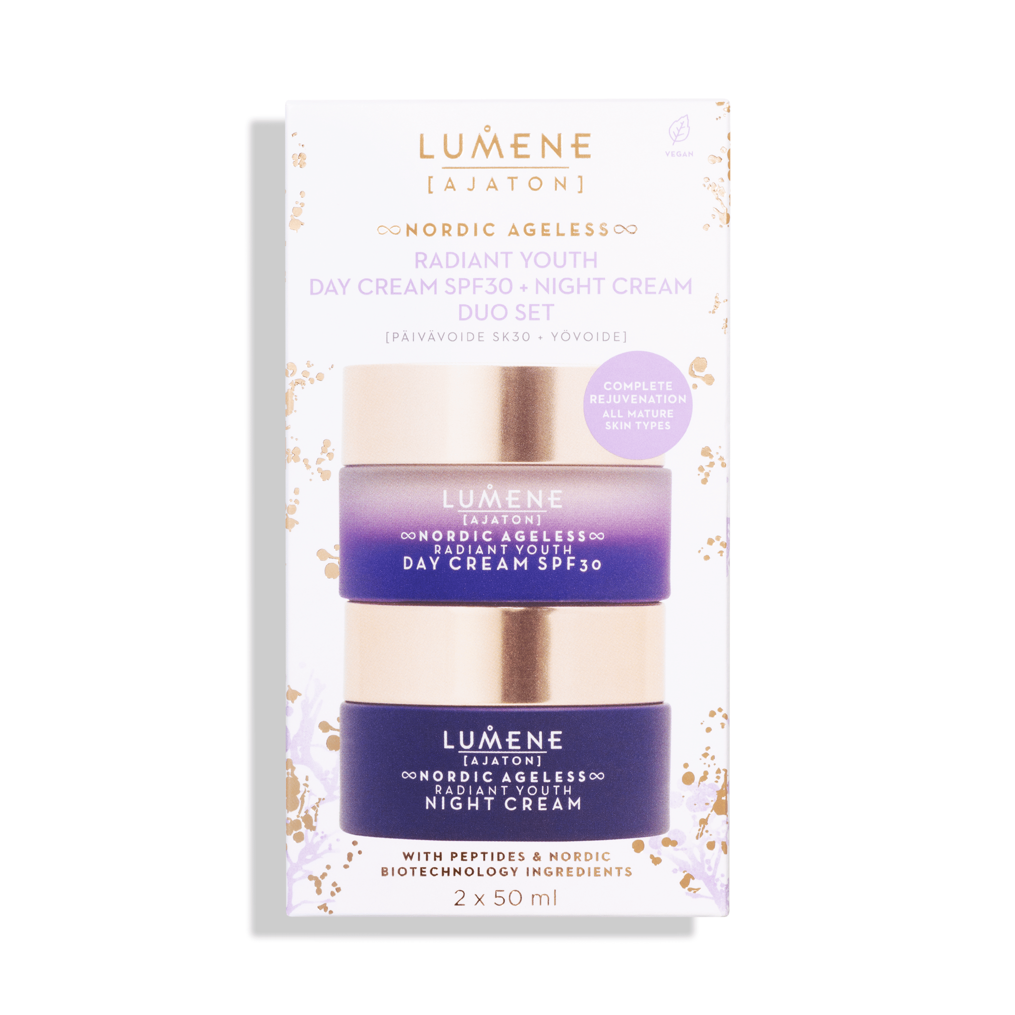 LUMENE Nordic Ageless [Ajaton] Duo Set нь арьсыг чангаруулж, толигор сайхан, гэрэлтсэн болгох өдөр болон шөнийн тоснуудыг агуулна. Багцад: Radiant Youth Өдрийн тос SPF30, 50 мл, Radiant Youth Шөнийн тос, 50 мл