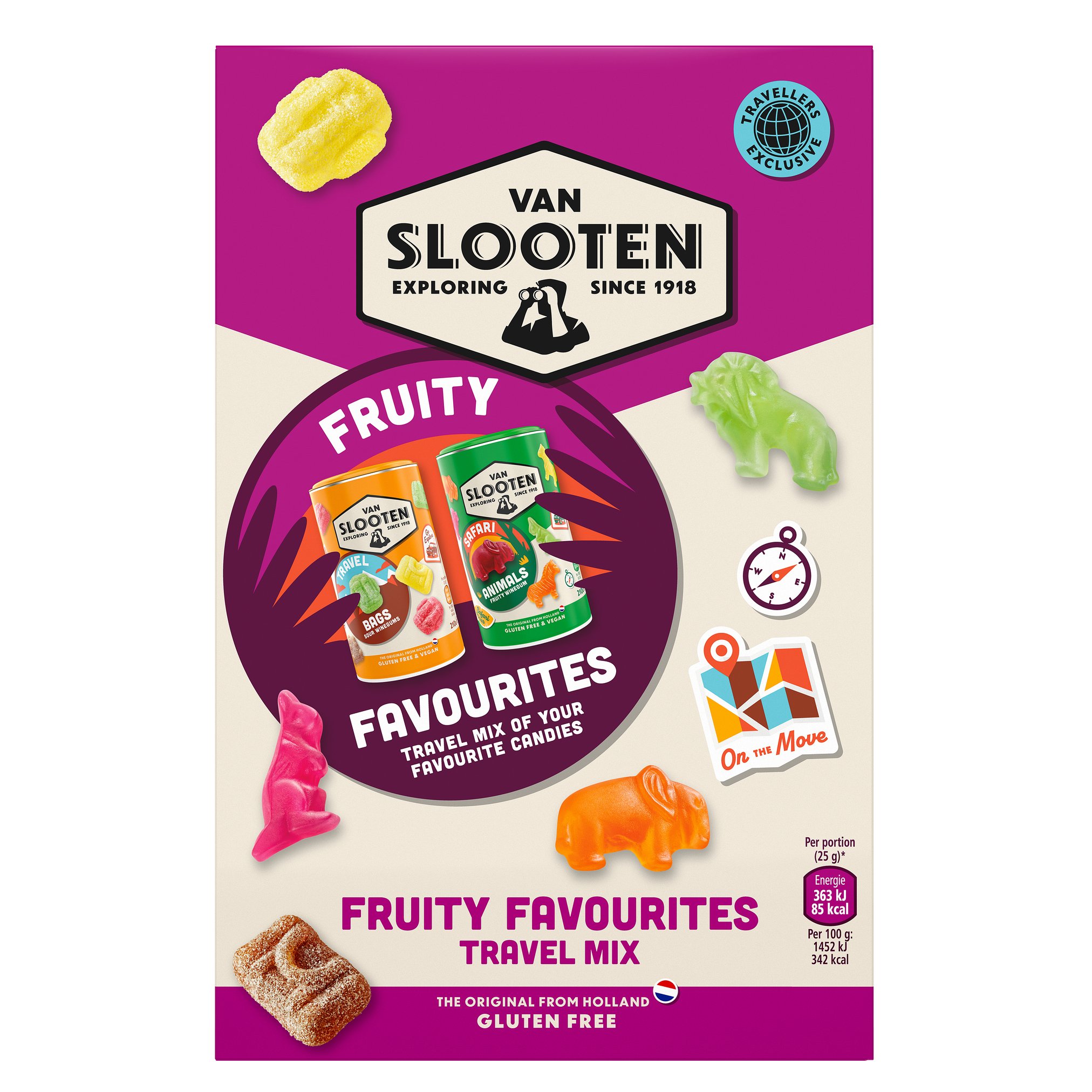 Аялалд зориулагдсан, аяллын үеэр худалдаалагддаг 900гр хайрцагт савлагдсан алдарт Van Slooten Fruity Favourites, глютен агуулаагүй.
